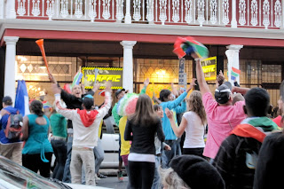 South Africa’s team Bafana Bafana (“the guys”) played the opening match against Mexico in Johannesburg, and I went to Long Street to join in the World Cup fever! The streets were PACKED with people covered in Bafana Bafana gear, and the vuvuzelas didn’t stop all day. Crowds gathered anywhere they could find a TV to watch the game. I could never really get close enough to a TV to watch the game, but I was able to monitor the score… and watching the Long Street crowd was plenty of entertainment. Bafana Bafana tied Mexico, which was a huge achievement! When Bafana Bafana scored, people went crazy! An elderly woman nearby got showered as beers were poured off a balcony in celebration. Vuvuzelas, dancing, shouting, and high fives all around.